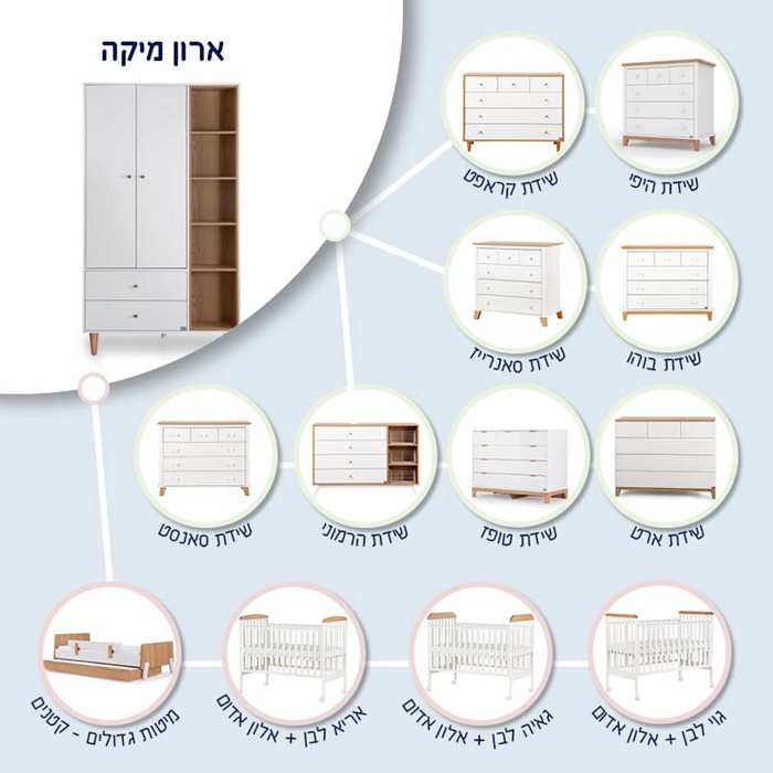 ארון מיקה הצליח לפצח ולהעניק מענה מושלם של עיצוב ופרקטיקה חכמה. הארון מעוצב עם 3 שטחי אחסון: ארון סגור, ספריה פתוחה עם 5 מדפים,ואחסון נוסף סגור בדופן הארון. עיצוב קלאסי של קווים נקיים וסטייל - שילוב של לבן טבעי.