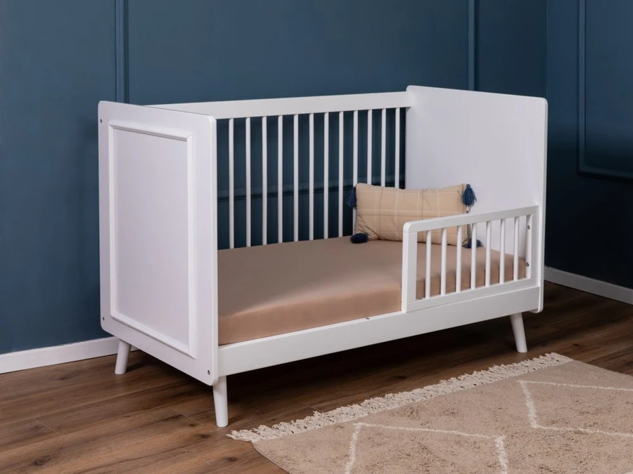 פרופילי עץ המעטרים את ראש המיטה והופכים אותה לכה ייחודית. המיטה גדלה עם התינוק והופכת למיטת מעבר עם מעקה טודלר כלול בערכה.