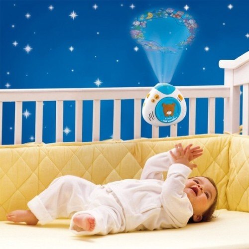 מנורת לילה ומקרן “דוב החלומות המתוקים” מבית ויטק – מקרן קטן המפיץ אור נעים ומציג תמונות נעות על גבי התקרה מעל התינוק תוך השמעת צלילי טבע, מנגינות מרגיעות ושירים.