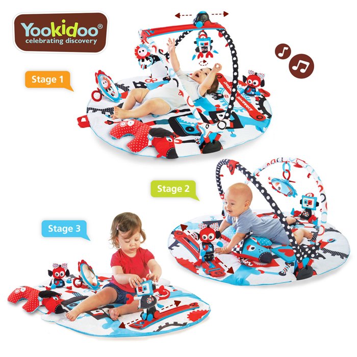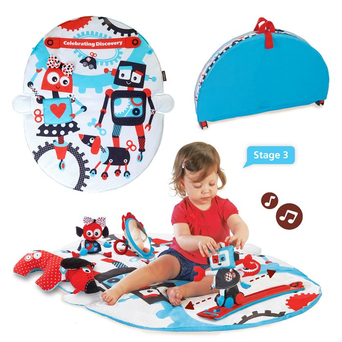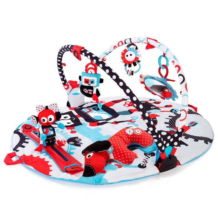 משטח פעילות בצבעי שחור לבן אדום עם מנגנון נעילה בטיחותי, 2 דמויות בד צבעוניות בצורת רובוט מקסים,כרית כלבלב בטקסטורות בד שונות דו צדדי, מראה הניתנת לתלייה ופרצוף בצורת פרח עם חרוזים הם חלק ממשטח האוניברסיטה.