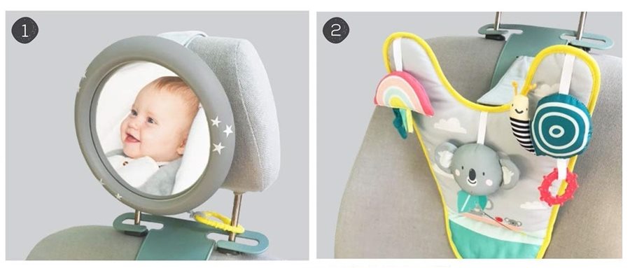 תיאור: משחק יחודי לרכב הכולל מראה דרכה משתקף התינוק היושב בניגוד לכיוון הנסיעה במושב האחורי של הרכב ומרכז הפעלה עם צעצועים תלויים. ניתן להשתמש בשני החלקים ביחד או לחוד. המראה מתחברת בקלות למשענת ראש הכסא, כוללת חיבור בטחון יחודי ומתכווננת לגובה התינוק. מרכז ההפעלה מתחבר אל מוטות משענת הראש ומתכוונן לגובה התינוק.