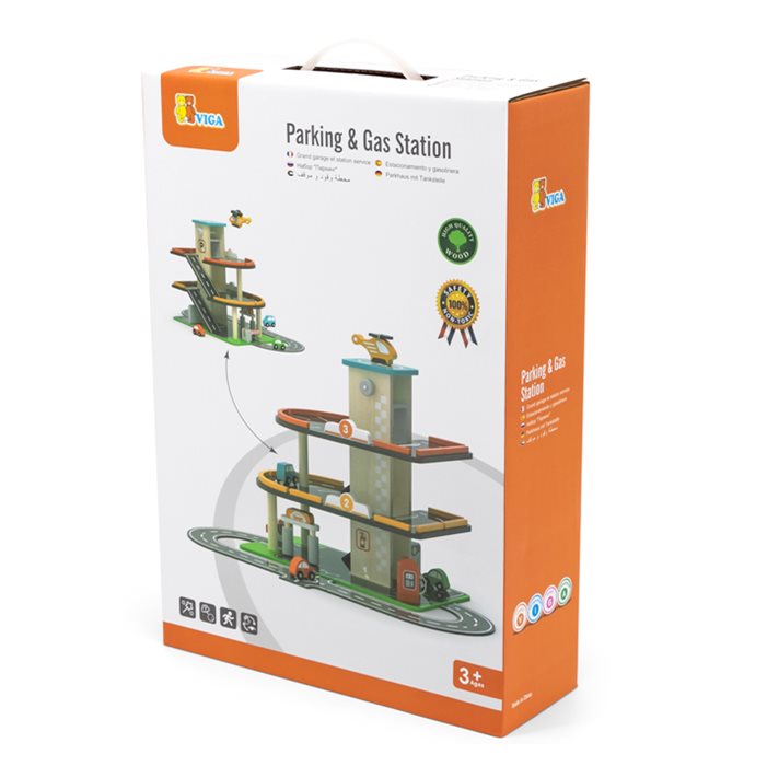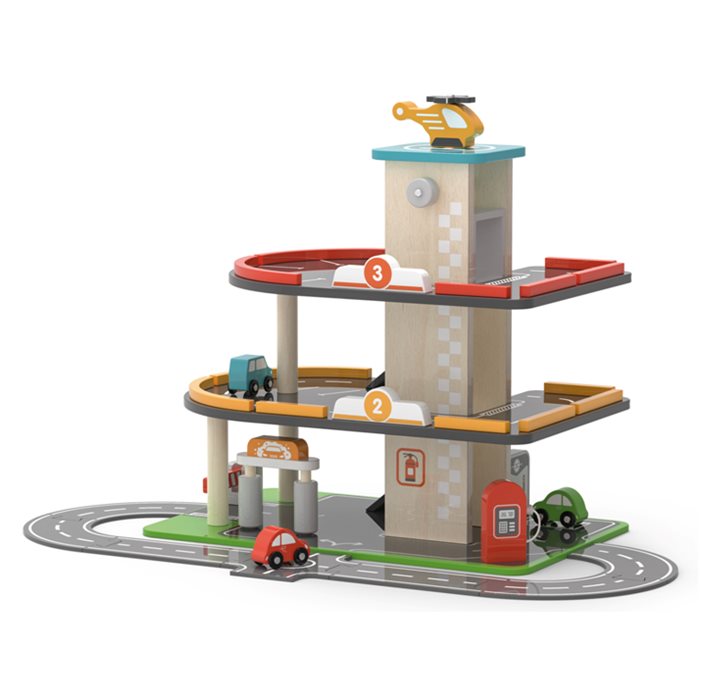 חניון משחק למכוניות 2 קומות עשוי עץ מלא. כולל 3 מכוניות, 1 מסוק, 1 תחנת תדלוק, 1 מעלית, 1 תחנת שטיפה. מתאים מגיל 3 ומעלה. מידות במצב מורכב: 25 על 27.5 על 39.5 ס"מ. נדרשת הרכבה ע"י מבוגר.