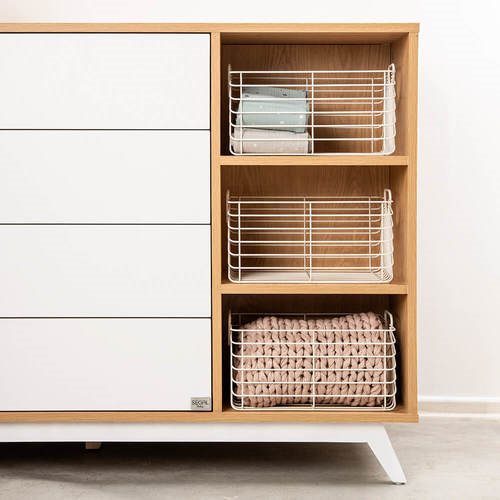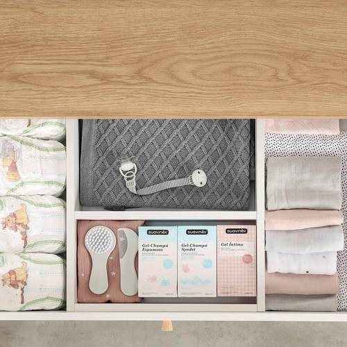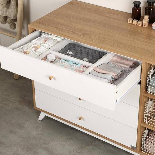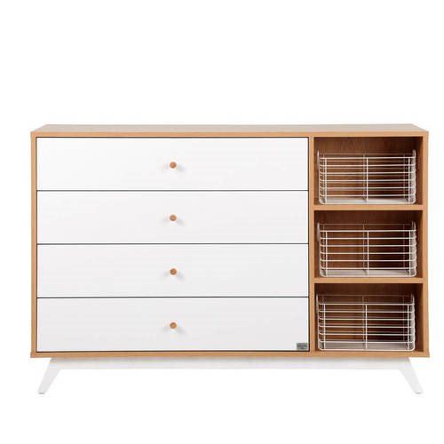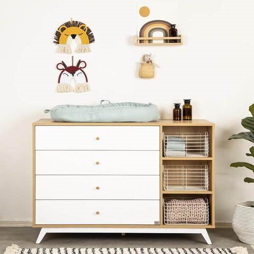 שידה ברוחב 140 ס”מ, מסדרת המודרן, רחבה במיוחד , עוצבה מ MDF מלא איכותי וחזק – כולל פנים מגירות, עם גימור אולטרא גלוס. השידה מכילה מדפים פתוחים עם סלסלות נוספות לאחסון, המגירות מחולקות באופן בו הם מייצרים סדר וארגון פונקציונאלי למוצרי ובגדי התינוק, כך שיהיה לכם נוח לחתל ולהחליף בגדים על השידה. כדי לשמור על בטיחות התינוק שלכם שילבנו בשידה מוט פלדה מחושלת לחיזוק מבנה השידה לאורך זמן. כמו כן ניתן לקבע את השידה לקיר