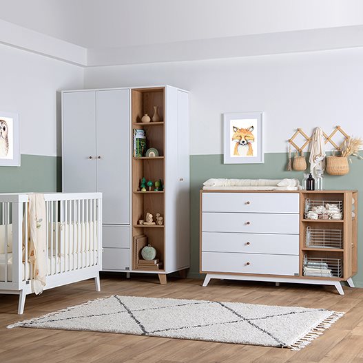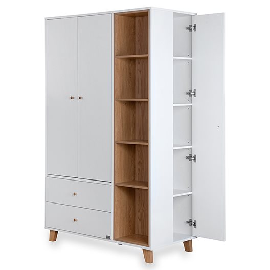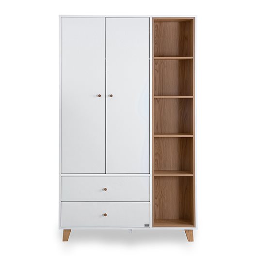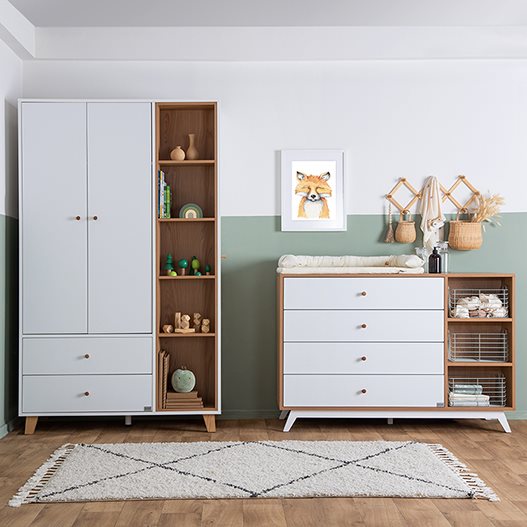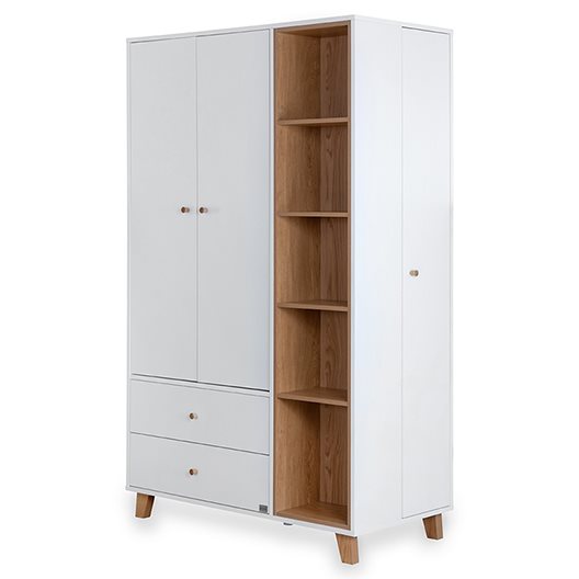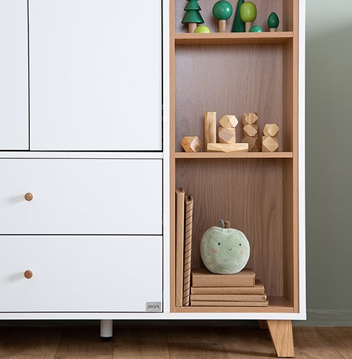 שילוב ארון בחדר התינוק מחייב מחשבה ולכן המשימה של המעצבים שלנו היתה לפתח ארון גדול ולא מאיים שמתאים במיוחד לחדר תינוקות וילדים – ואכן ניתן לראות כי העיצוב המינימסליטי מצליח לשמור על נינוחות ולהשאיר את החדר מאוורר. הארון מגיע עם 3 תאי אחסון : ארון סגור ברוחב 80 ס”מ, תאים פתוחים רוחב של 41 ס”מ וארון סגור בצד ימין ברוחב של 30 ס”מ. הפשטות הנקייה של הארון בשילוב ידיות לבנות נוחות המשתלבות בשקט מייצרות עיצוב עכשווי על זמני. העיצוב לא מעמיס ומעניק לפשטות יתרון בולט.הארון מתאים לסגנונות עיצוב רבים והוא מתוכנן בצורה חכמה. סידור הארון הפנימי גמיש וניתן להתאים אותו לצרכים המתפתחים של התינוק וההורים.