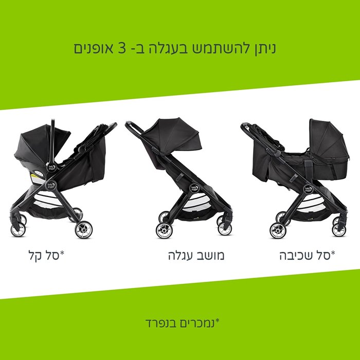 - ניתן להשתמש בתוספת סל קל/סל שכיבה (הנמכרים בנפרד) - העגלה עוצבה מחדש עם חיבור לסל קל ומרכב שכיבה (באמצעות מתאמים) המותאמים מגיל לידה, כך שתוכלו לטייל עם ילדכם (מתאמים לסל השכיבה מגיעים יחד עם הסל שכיבה. מתאמים לסל קל נמכרים כמוצר נפרד)