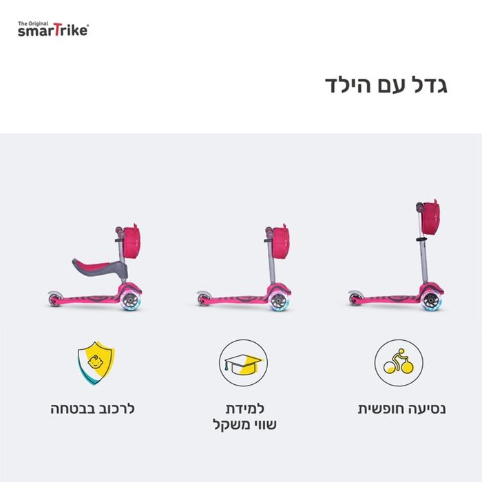 מתאים לפעוטות מגיל 15 חודשים ומעלה, קורקינט סמארט טרייק T1 מציע 3 שלבי התפתחות שונים המאפשרים לילד שלך לצבור ביטחון וכישורים באופן הדרגתי, לחוויית רכיבה עצמאית ובטוחה.