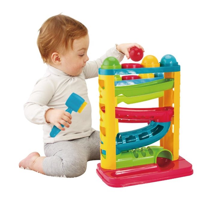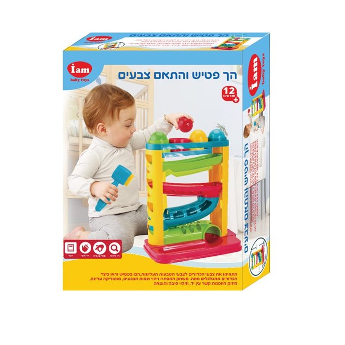 התאימו את צבעי הכדורים לצבעי הטבעות העליונות, הכו בפטיש וראו כיצד הכדורים מתגלגלים מטה.