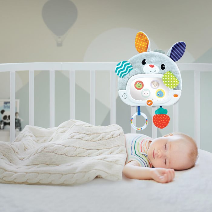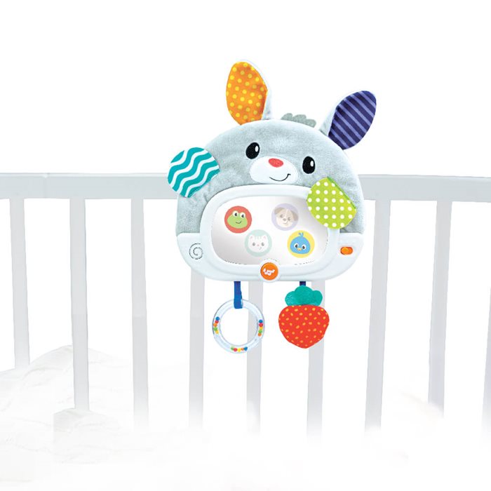 מראת ארנב קסם מבד רך ונעים ומרקמים שונים, המציגה 4 דמויות חבויות המופיעות במראה, עם 2 מצבים- מצב בוקר: לחצו על לחצן המוסיקה למנגינה עליזה ומשמחת, משכו בטבעת או בנשכן ותתגלה לכם דמות של חיה וקולה האופייני.