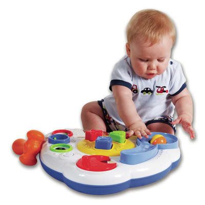 שולחן פעילות עם השחלת כדורים והתאמת צורות, עם 5 קלידים מהבהבים, מצב משחק מוסיקלי המשמיע מנגינות. על ידי הסרת רגלי השולחן המשחק הופל למרכז פעילות בישיבה על הריצפה.