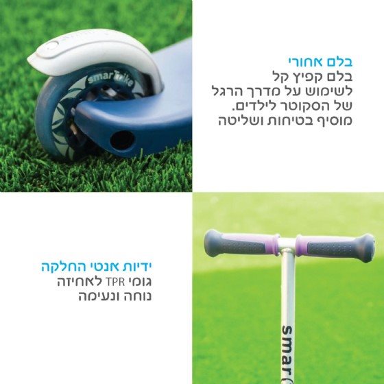 קורקינט סקוטר T3 הינו בעל עיצוב שווייצרי, מדרך רגל מגומי TPR למניעת החלקה, ידיות אחיזה אנטי-החלקה, שילדת אלומיניום ומעצור פלדה.