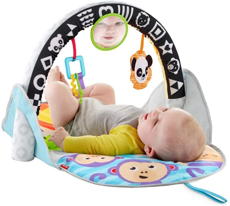 כולל 3 צעצועי תלייה הניתנים להסרה : מראה לחיזוק הכרת האני של התינוק , רעשן פנדה וצעצועי למישוש.