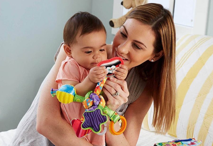 אחוז ומשוך לחיזוק הכישורים המוטורים. צלילי צפצפה, מצלצלים ומרשרשים. טבעות נשכנים מקליקות. מראה לגילוי לחיזוק “הכרת האני”. לולאת חיבור לתלייה ומשחק בעת ניידות.