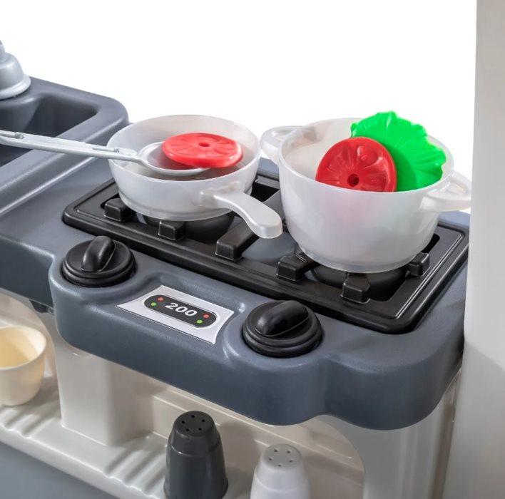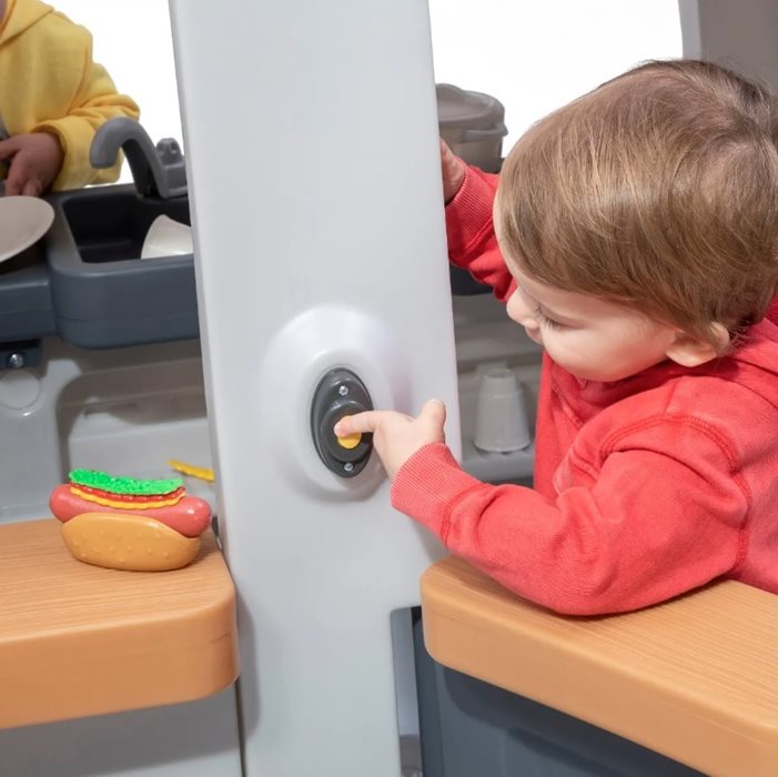 כולל אזור מטבח מעוצב עם כיור גדול, כיריים עם ידיות מסתובבות עם אורות וצלילים והרבה מקום אחסון.