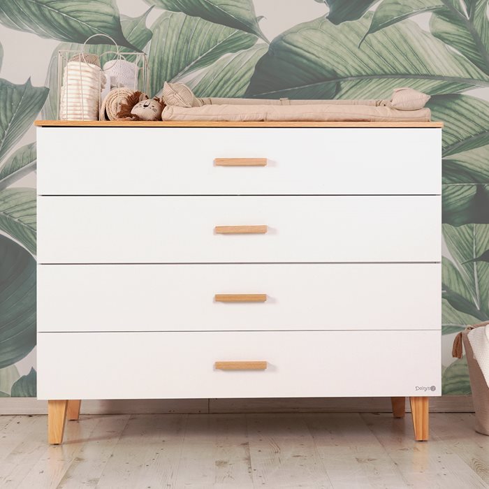 שידת ראנצ׳ – לשידת ראנצ’ ארבע מגירות ולכל מגירת ידית מעץ. למגירה העליונה חלוקה פנימית, המגירה מחולקת לשלושה חלקים וע”י כך מציעה ניצול מקסימלי, שימוש אופטימלי ונגישות מלאה לכל פריט (מומלץ לאחסן במגירה זו את הפריטים שבהם נעשה שימוש רב יותר כמו: חיתולים, מגבונים, מוצצים, בגדים וכו).