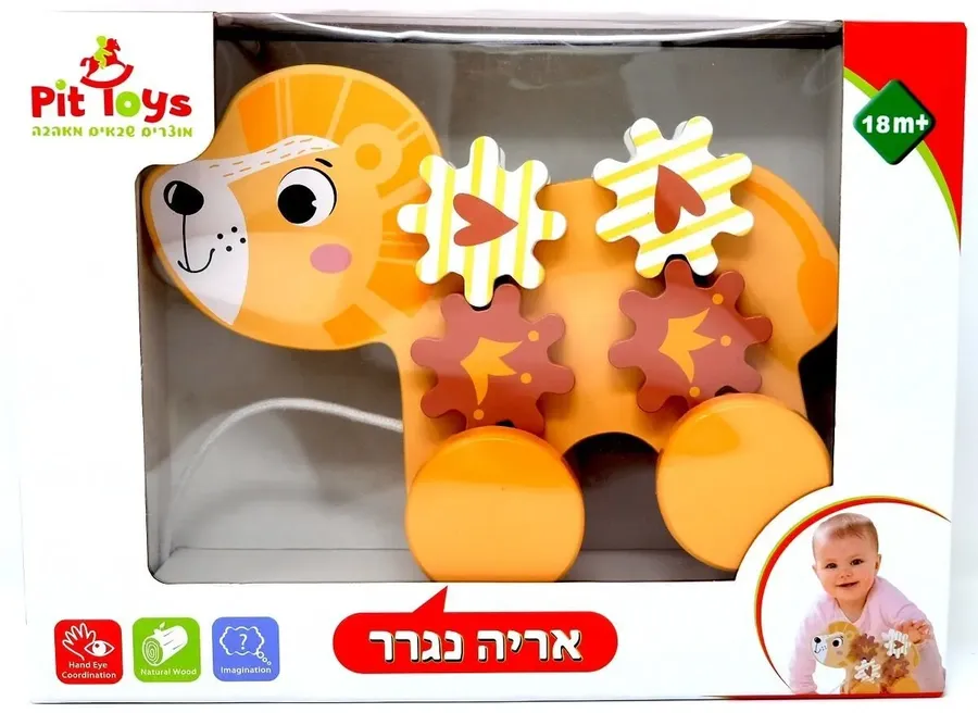 נגרר עם גלגלי שינים מסתובבים מעץ מלא - אריה פיט טוייז.