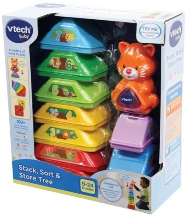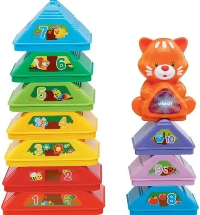 בונים מגדלים, מחברים חלק לחלק, מניחים את החתול המדבר על גבי החלק העליון והוא מלמד צבעים ומספרים.