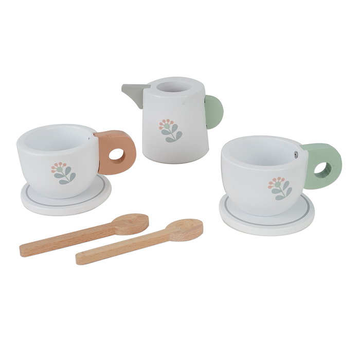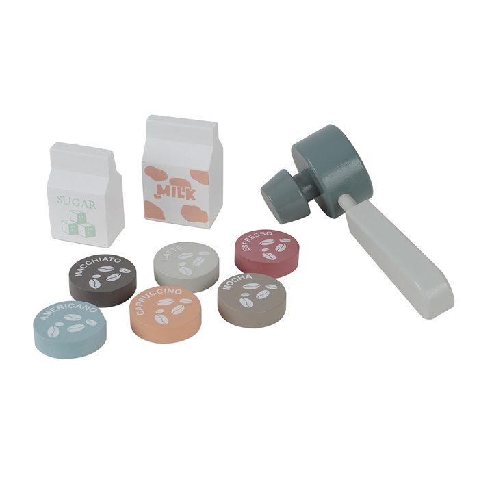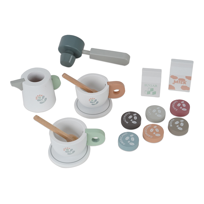 - הצעצוע כולל 17 חלקים מעץ: מכונת קפה, מסנן / פילטר, קנקן, 2 ספלים, 2 תחתיות, 2 כפיות, 6 קפסולות קפה, חלב, סוכר