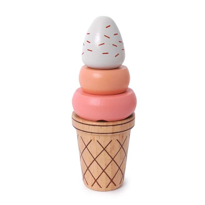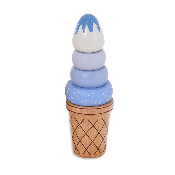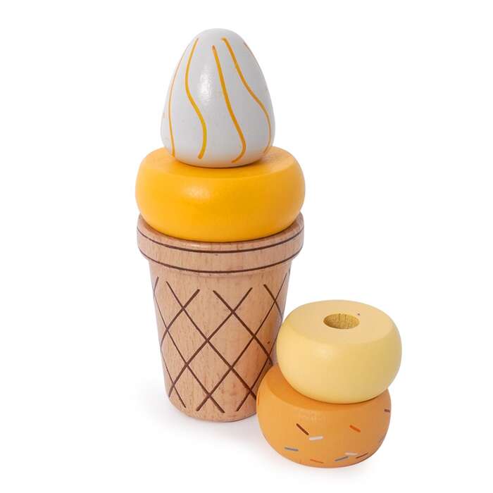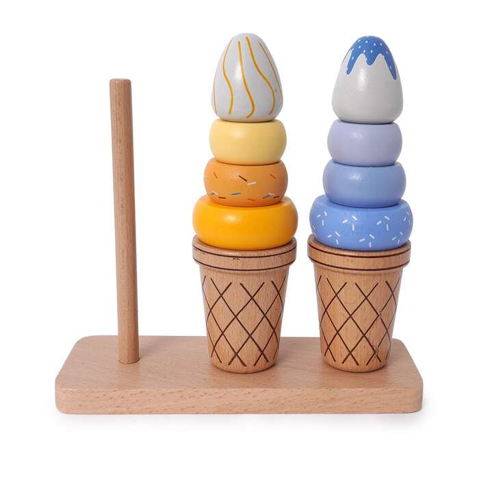 - הצעצוע כולל: משטח השחלה מעץ, 3 גבעי גלידה מעץ, 9 טבעות הרכבה, ו-3 כדורי גלידה מעץ