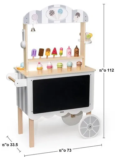 עגלת גלידה ענקית ומאובזרת מבית ויגה. כוללת מגוון של אביזרי משחק: כלי סירופ שוקולד, כלי סירופ מייפל, גביעי גלידה, טילונים, קרטיבים, כף גלידה, פעמון, מטבעות משחק ועוד… כל החלקים מתחברים אחד לשני באמצעות מגנטים בחלקו האחורי של הדוכן מקום אכסון גדול