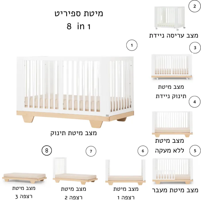 – 1 ב 8 – 8 מצבי שימוש : 1. מצב עריסה על גלגלים 2. מיטת תינוק על גלגלים 3. מיטת תינוק על רגלי עץ 4. מיטת מעבר עם מעקה 5. מיטת תעבר ללא מעקה (3 פאות) 6. מיטת מעבר עם 2 פאות – ראש ורגליים אחת 7. מיטת מעבר עם פאה אחת 8. מיטת רצפה