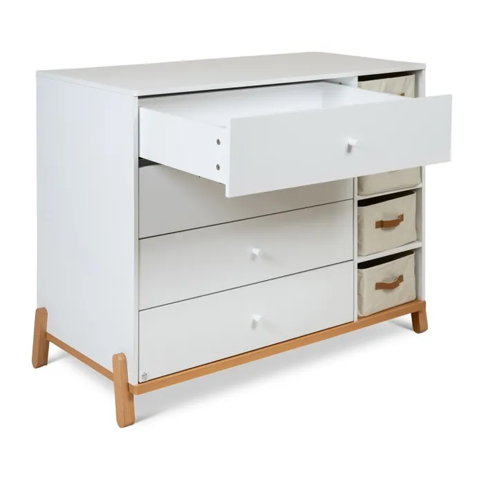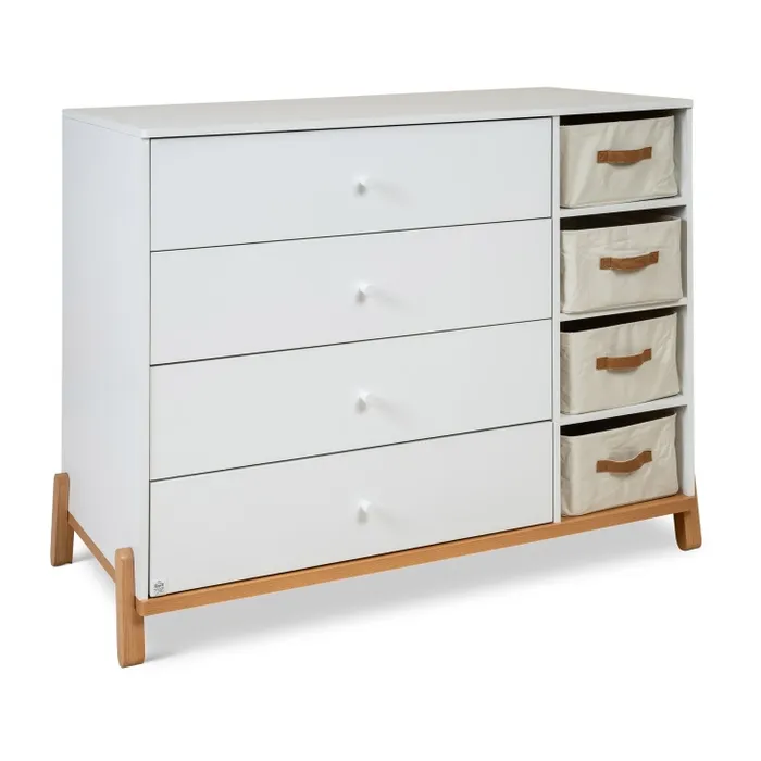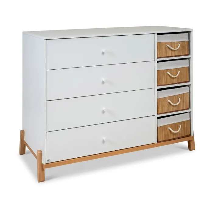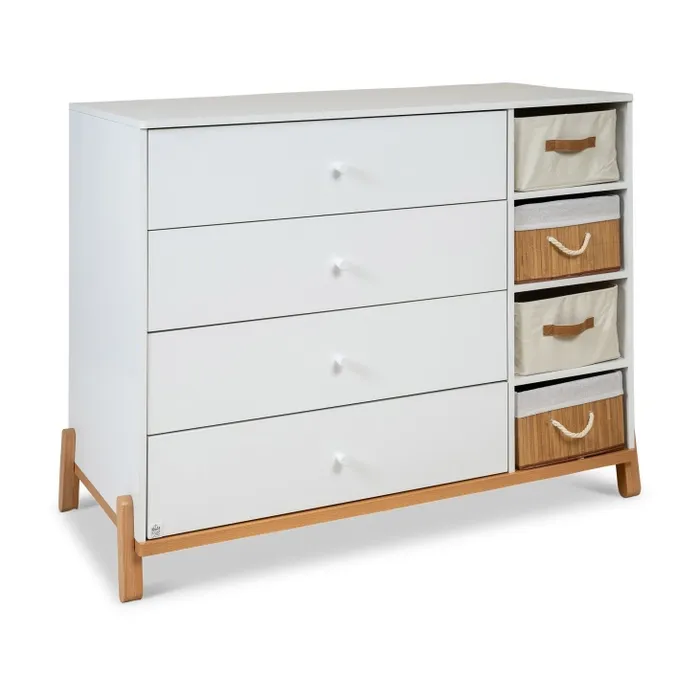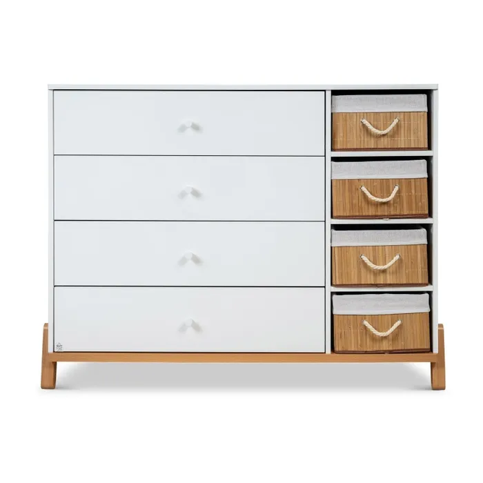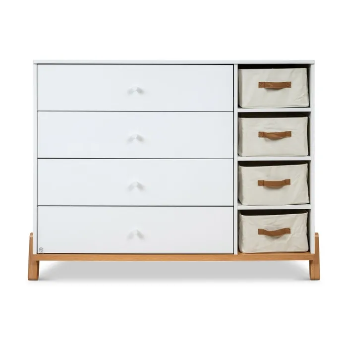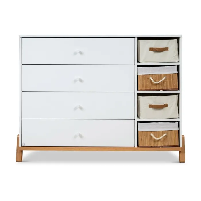 השידה מאובזרת ב-4 סלסלות ו4 מגירות לאחסון נוח ועיצוב פשוט מושלם! וזה עוד לא הכל… היא מאובזרת במסילות נסתרות טריקה שקטה אוטומטיות ורגליים מעוצבות עשויות עץ בוק מלא. הגוון הלבן בשילוב צבע עץ טבעי מעניק לה מראה כפרי מרגיע, בדיוק מה שאתם אוהבים!