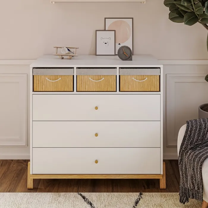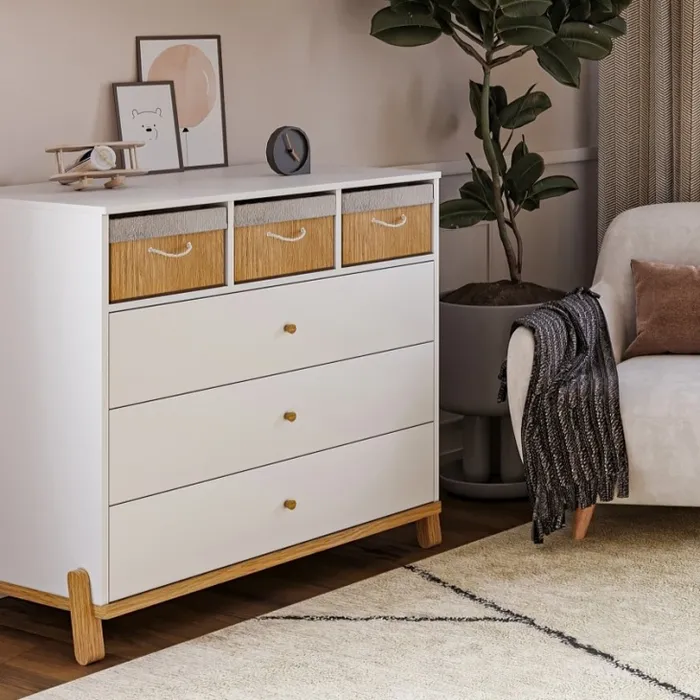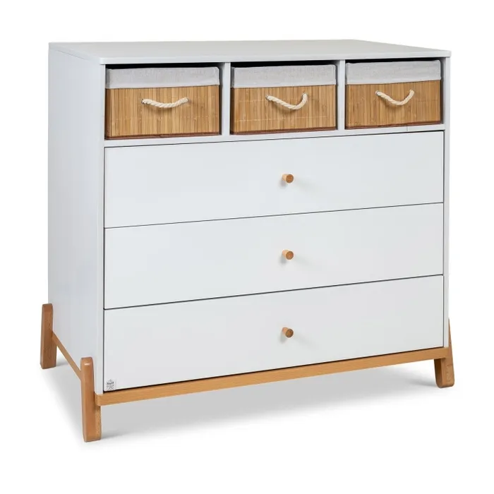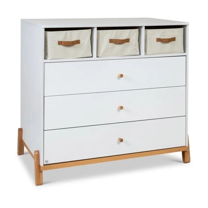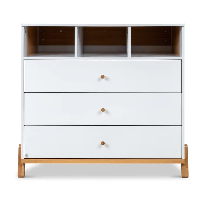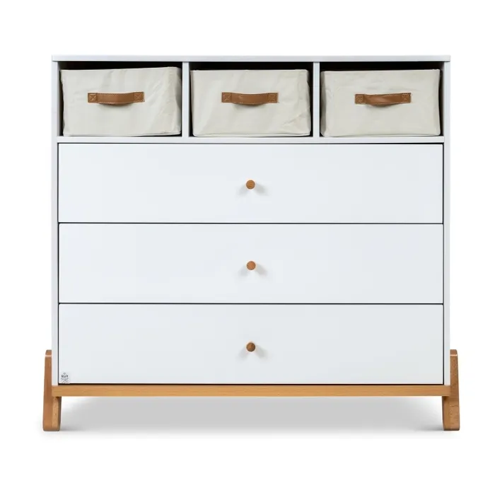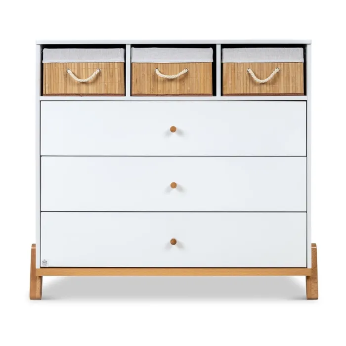 השידה מאובזרת ב-3 סלסלות ו3 מגירות לאחסון נוח ועיצוב פשוט מושלם! וזה עוד לא הכל… היא מאובזרת במסילות נסתרות טריקה שקטה אוטומטיות ורגליים מעוצבות עשויות עץ בוק מלא. הגוון הלבן בשילוב צבע עץ טבעי מעניק לה מראה כפרי מרגיע, בדיוק מה שאתם אוהבים!