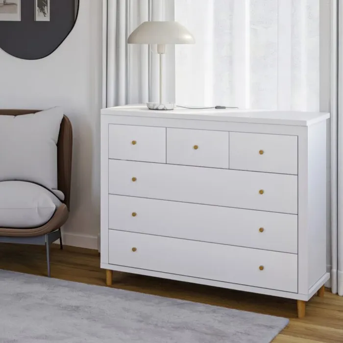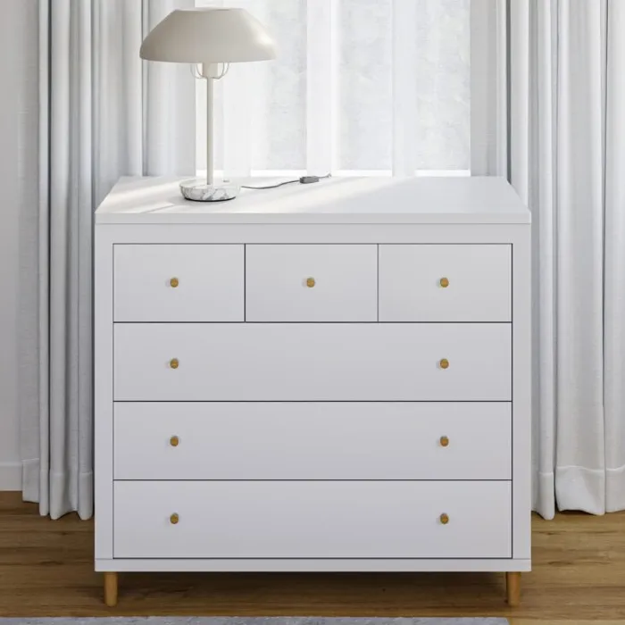 שידת ניו יורק מאובזרת במסילות נסתרות טריקה שקטה אוטומטיות, עם עיצוב קלאסי עדין, 6 מגירות מרווחות ורגליים מעוצבות העשויות עץ בוק מלא. הגוון הלבן בשילוב צבע עץ טבעי מעניק לה מראה ייחודי, בדיוק מה שחיפשתם, נכון?