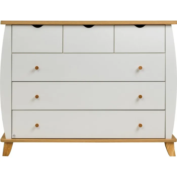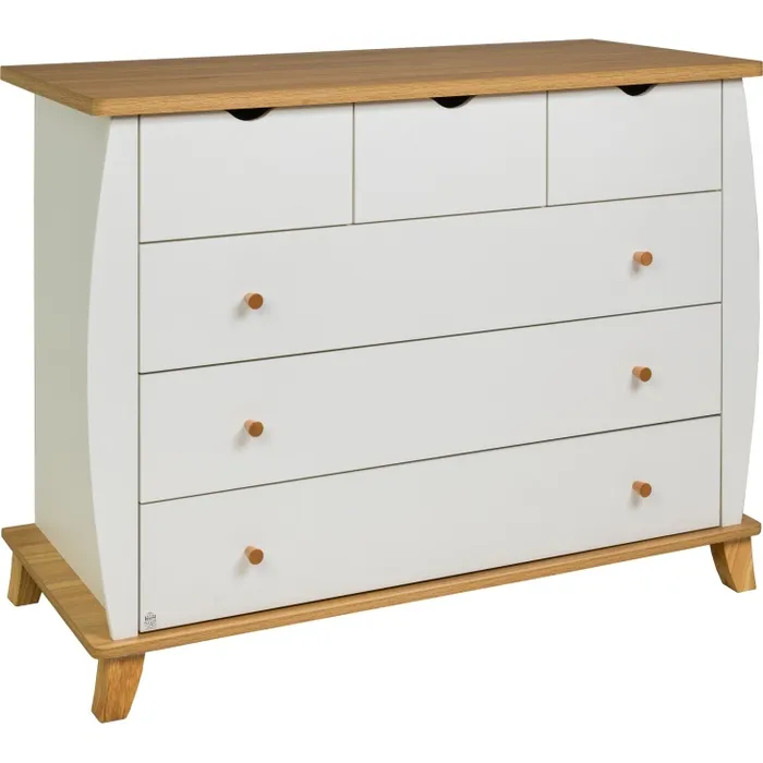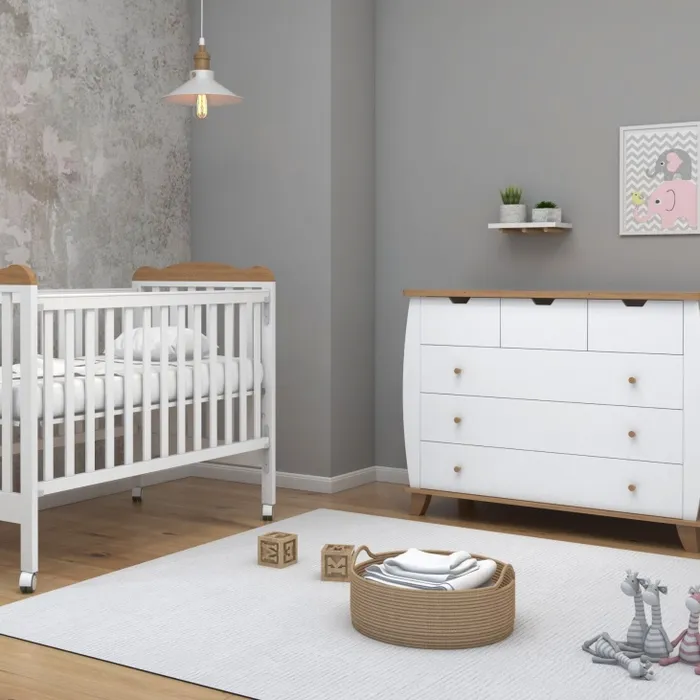 חדר השינה המהמם מעוצב בקפידה, עם שילוב לבן ועץ שנותנים לו שיק ייחודי. השידה מגיעה עם חלוקת מגירות פרקטית ל-3 מגירות קטנות ותוספת של 3 מגירות גדולות. מותקנות בה מסילות טלסקופיות איכותיות בעלות כושר נשיאה גבוה, עם פינה מעוגלת בפלטה עליונה להחתלה בטוחה, ופינה מעוגלת בפלטה התחתונה לשמירה על סביבה בטוחה לתינוק.