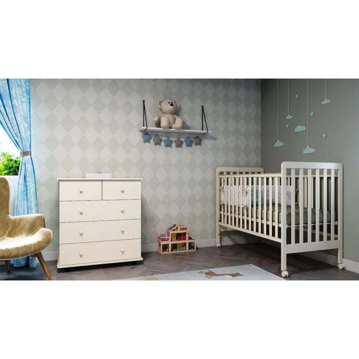 פרטים טכניים ומידות:שידה קלאסית• בעלת חלוקה ל 5 מגירות המאפשרות פרקטיות מירבית במחיר נמוך.• שילובי צבעים אפשריים: לבן • מסילות: בשידה זאת מותקנות מסילות גלגל לבנות• מידות השידה: רוחב 82 ס"מ, עומק 59 ס"מ, גובה 92 ס"ממיטת תינוק דגם אביב• צבע: לבן • חומר גלם: עץ מלא• פרטים נוספים על המיטה: מיטת תינוק העומדת בכל דרישות תקן מיטת תינוק מספר 682.• שילובי צבעים אפשריים: לבן • אנטי בייט: במיטה זאת לא מותקן אנטי בייט• מתאים לשימוש עם מזרן במידות: 125 ס"מ אורך, 60 ס"מ רוחב, 9 ס"מ גובה• מידות חיצוניות: 130 ס"מ/ 68 ס"מ/ 110 ס"מ