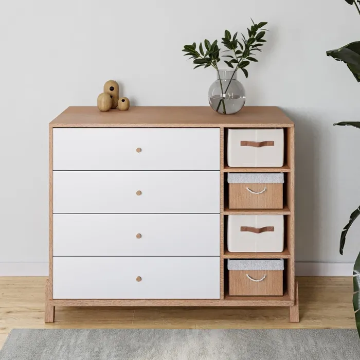 חדר השינה מגיע בעיצוב קלאסי עם קווים מודרניים, השילוב לבן ועץ ובתוספת סלסלות עשויות עץ במבוק. חדר השינה עשוי מחומרים באיכות גבוהה תוך שמירה על גימור ללא פשרות. שידה אורבינו מאובזרת ברמה הגבוהה ביותר, עם מסילות נסתרות טריקה שקטה רגליים מעוצבות עשויות עץ בוק מלא. הגוון הלבן בשילוב צבע עץ טבעי מעניק לה מראה חדיש ומיוחד. השידה מאובזרת ב-4 מגירות מרווחות.