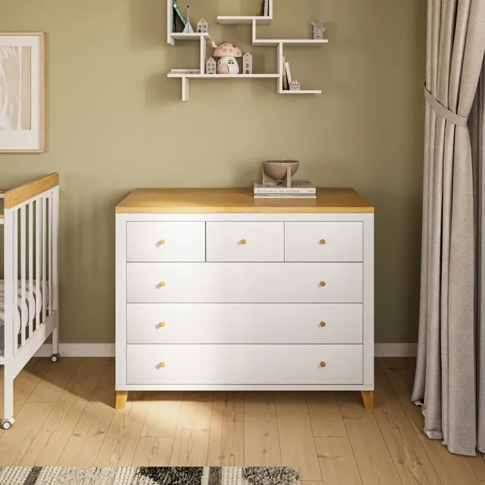 חדר השינה עשוי מחומרים באיכות גבוהה תוך שמירה על גימור ללא פשרות. השידה מאובזרת מסילות נסתרות טריקה אוטומטית שקטה, עם עיצוב קלאסי קליל ונקי וחלוקת מגירות פרקטית ונוחה 3 עליונה עם 3 מגירות רחבות. רגלי עץ מלא עמידות ומשתלבות מושלם עם גוון המיטה הארון.