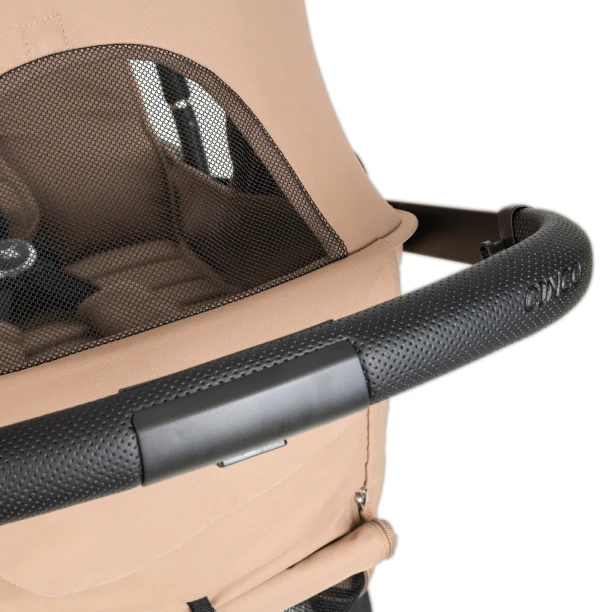 גב מושב הטיולון קשיח לתמיכה מותאמת, מעליו ריפוד מפנק ונעים.