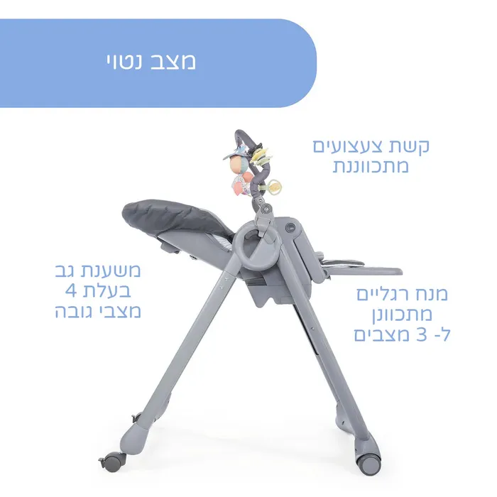 - בר משחק מתכוונן - בר המשחקים החמוד עם צעצועים תלויים שיבדר וישעשע את הילד, מתכוונן ל- 3 מצבים וניתן להשתמש בו עם המגש