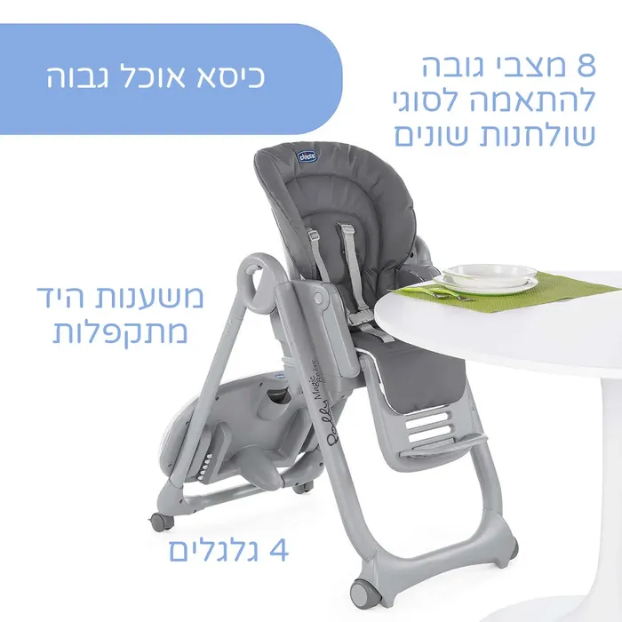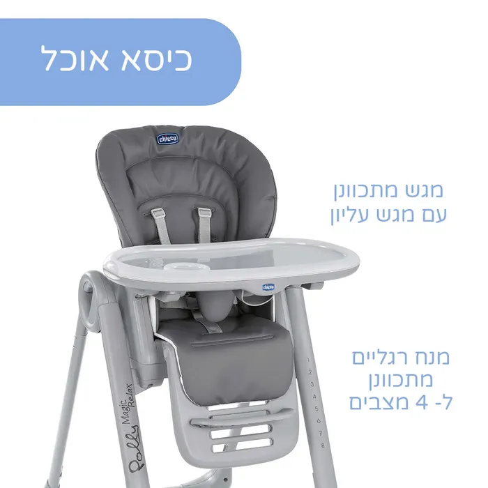 - מצב כיסא אוכל גבוה מיועד לילד המסוגל לשבת בכוחות עצמו מגיל 6 חודשים ועד גיל 36 חודשים ועד משקל של 15 ק”ג לשימוש ביתי בלבד – כשהילד גדול יותר, פולי מג’יק רילקס הופך לכיסא גבוה לשימוש ליד השולחן