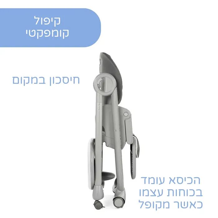 הסגירה הקומפקטית של הכיסא מאפשרת לסגור אותו במהירות והאיחסון שלו תופס מקום קטן בבית. - גיל : השימוש במצב הנטוי : מגיל לידה עד 9 ק”ג (6 חודשים) או כאשר התינוק יושב בכוחות עצמו | השימוש בכיסא האוכל מיועד לילד המסוגל לשבת בכוחות עצמו מגיל 6 חודשים ועד גיל 36 חודשים ועד משקל של 15 ק”ג