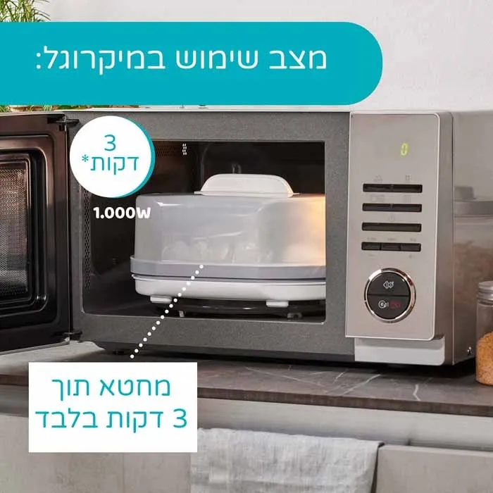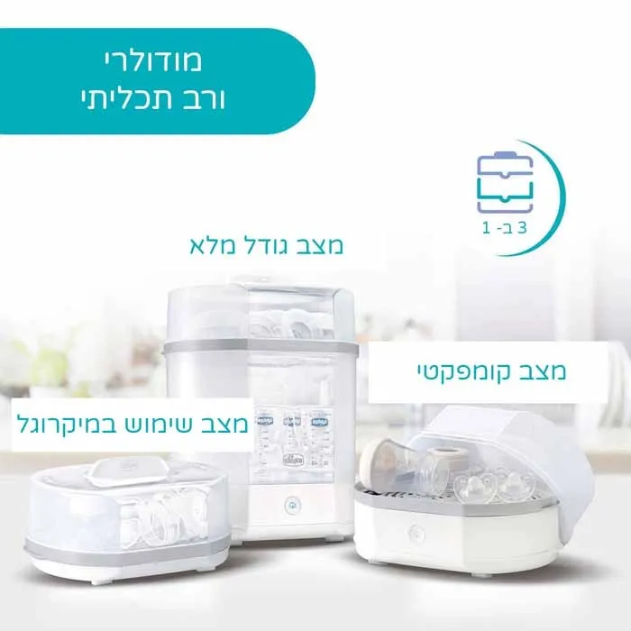 - מצב מיקרוגל מתאים לעיקור עד 2 בקבוקי האכלה של 330 מ”ל (בקבוקי Chicco והאביזרים שלהם או אביזרים קטנים כגון מוצץ) במהירות רבה יותר.