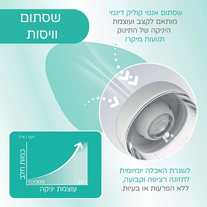 - פטנט חדשני – השסתום בתחתית הבקבוק מווסת מעבר אוויר, ומותאם לעוצמת היניקה של התינוק לנוחות האכלה מרבית.