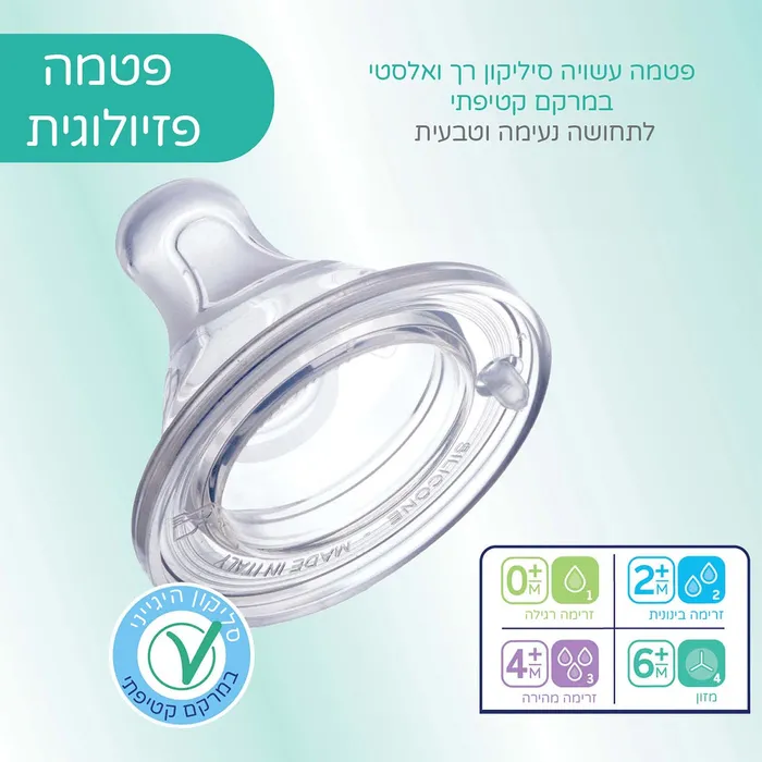 פטמה פיזיולוגית מותאמת להתפתחות התינוק עם 4 קצבי זרימה שונים: