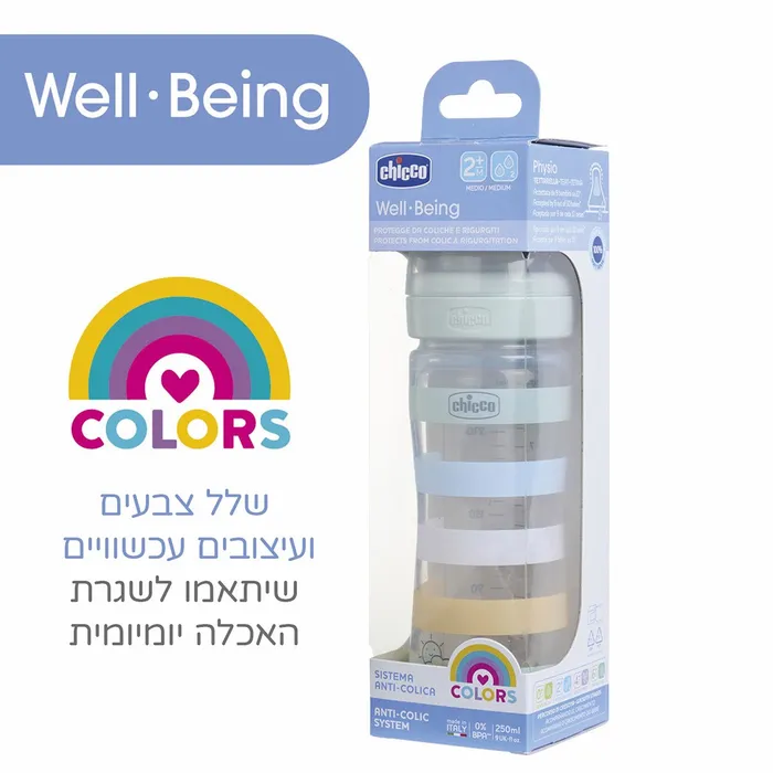 בקבוק וולביאינג של צ’יקו אידיאלי להאכלה יומיומית, עוזר להפחית את תופעת הקוליק, רגורגיטציה (מעבר של מיצי קיבה או של מזון לא מעוכל אל הגרון ואל חלל הפה) ומרגיע את התינוק.