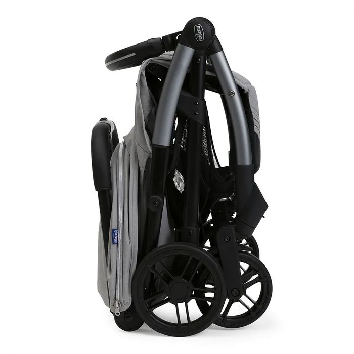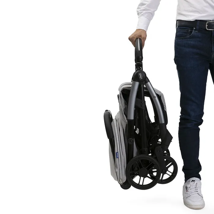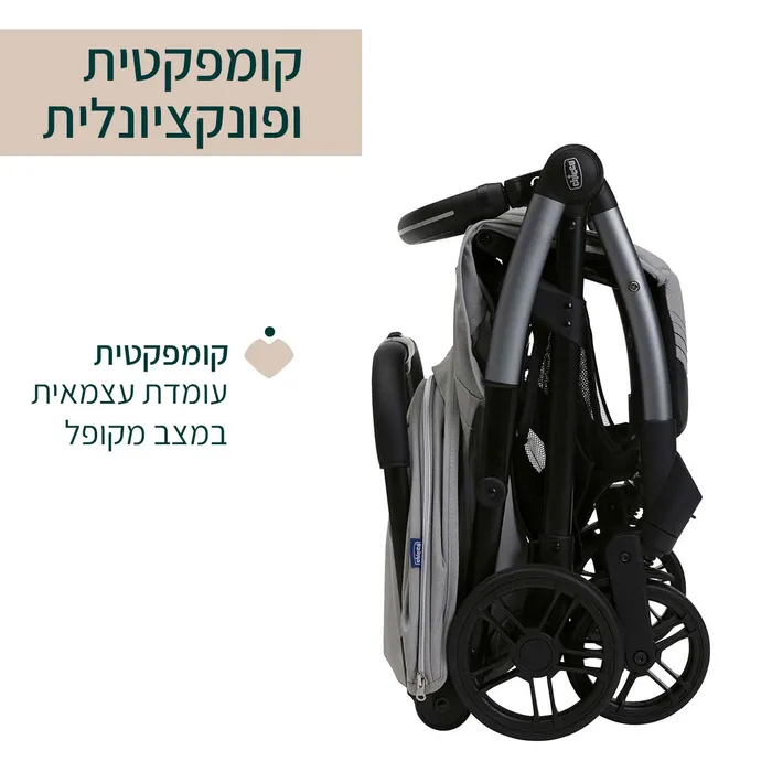 קיפול אוטומטי – העגלה תתקפל בעצמה בלחיצה אחת, במצב מקופל היא קומפקטית במיוחד, ועומדת עצמאית. בנוסף גם הפגוש מתקפל וע”י כך משיג קומפקטיות מקסימלית, או יכול לשמש כידית לנשיאה.