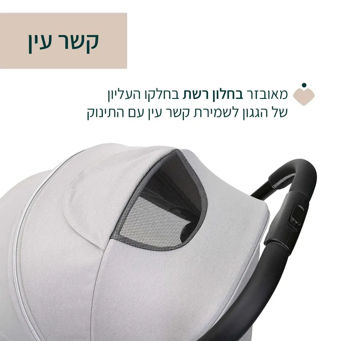 גגון עם הגנת +50 UV – גגון סופר מאובזר אשר יענה על כל הצרכים בכל עונה, יבטיח הגנה מרבית מפני רוח, אור ושמש, עמיד במים, ניתן להרחבה, ומאובזר בחלון רשת לשמירת קשר עין עם התינוק.