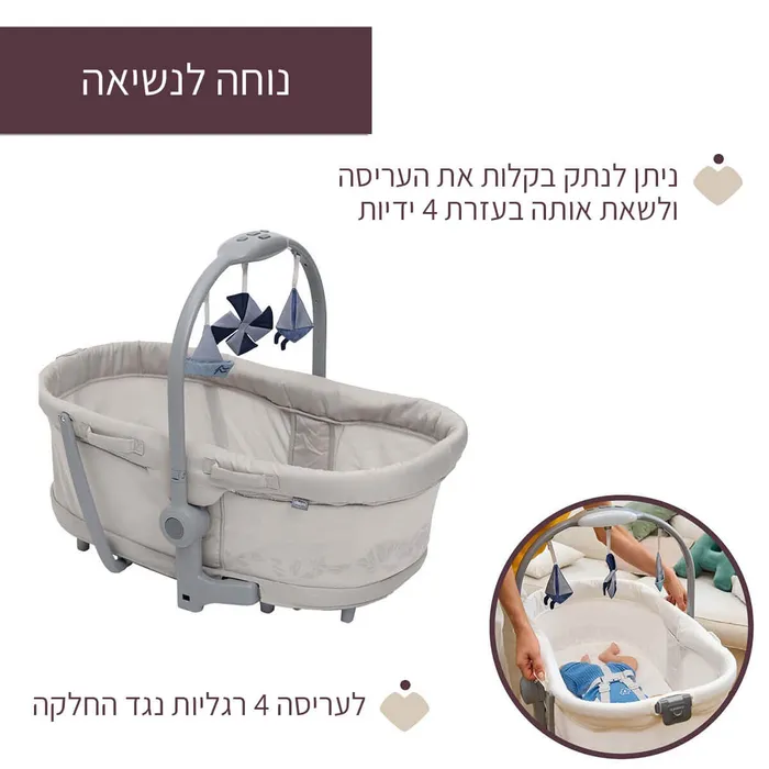- נוחה לנשיאה – ניתן לנתק בקלות את העריסה ולשאת אותה לכל מקום בעזרת 4 ידיות.