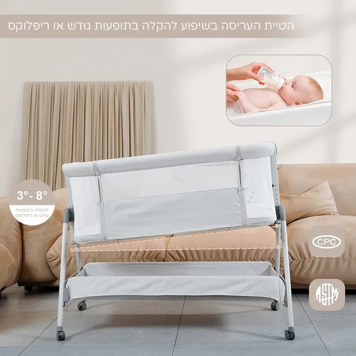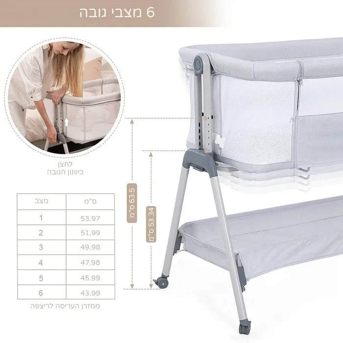 - גובה מתכוונן – עם 6 מצבי גובה שונים, העריסה מאפשרת התאמה אישית ונוחות מקסימלית. ניתן להטות את העריסה להקל על תופעות גודש או ריפלוקס.