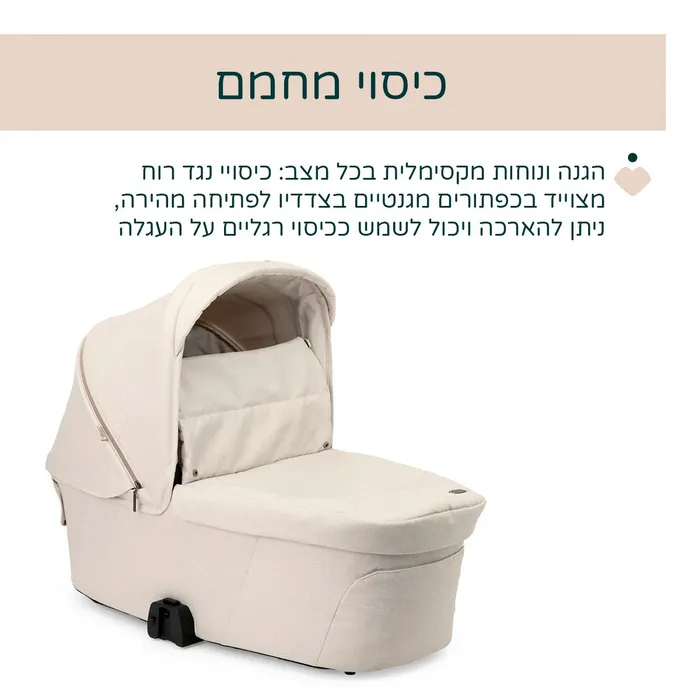 כיסוי מחמם ונשלף להגנה נוספת נגד רוח לימי החורף הקרים. הכיסוי כולל מגנטים בשני צדדיו לפתיחה מהירה, כך שתוכלו להסיר ולהניח את התינוק בקלות רבה.
