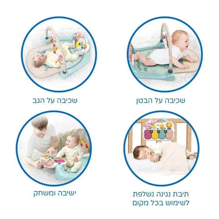 מקלדת פסנתר עם מוזיקה וצלילים - כאשר התינוק מכה או בועט במקשי הפסנתר הגדולים הוא מתוגמל במנגינות וצלילים.