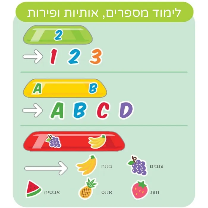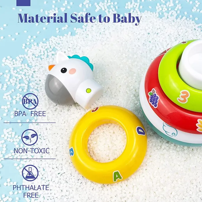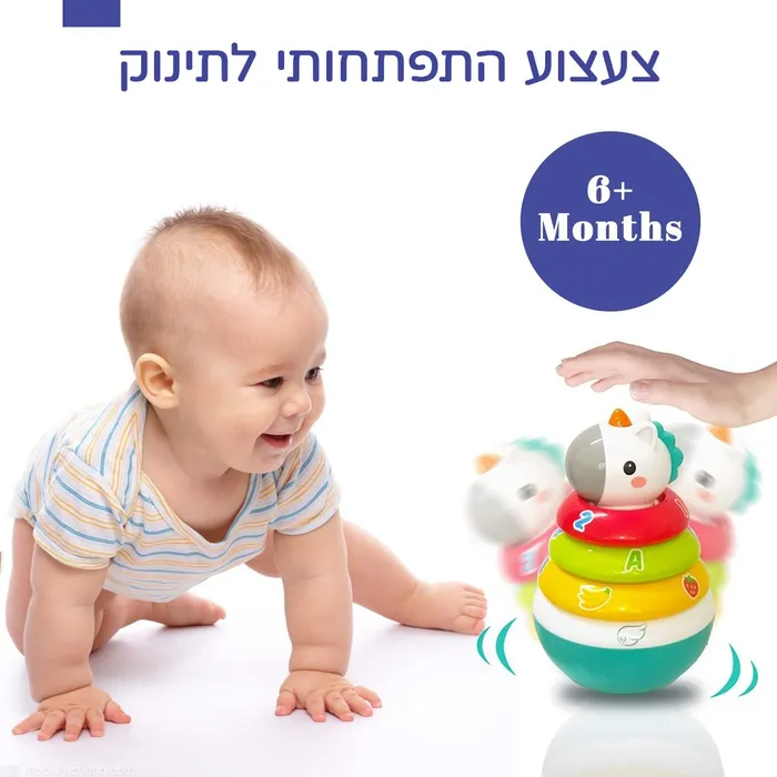 צעצוע מגדל טבעות מתנדנד בצורת חד קרן, עם 3 טבעות רעשן צבעוניות עם איורי פירות, אותיות, ומספרים, הצעצוע מפתח את חושיו ומרחיב את אופקיו של התינוק.