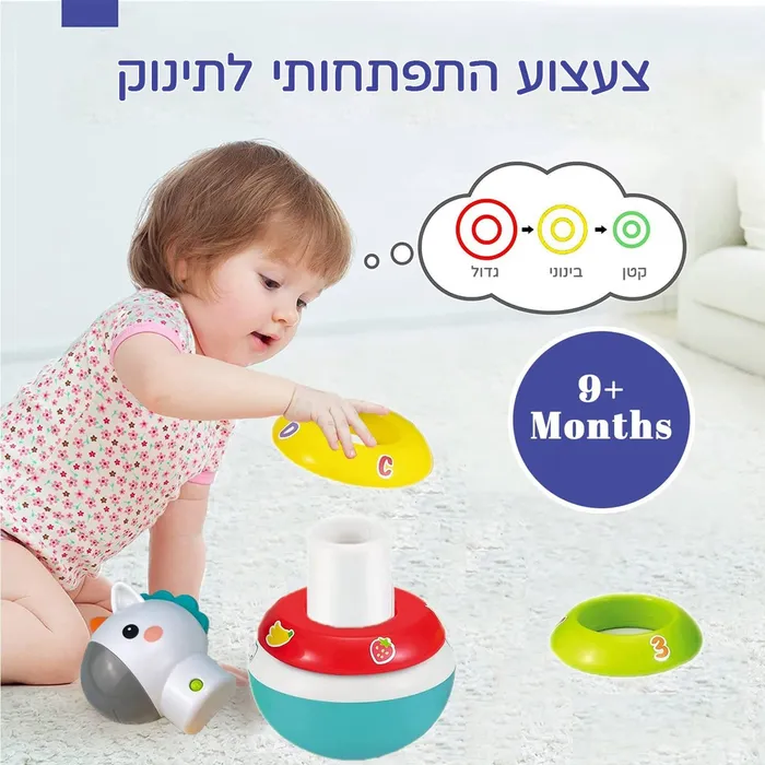 פיתוח מוטוריקה עדינה – תיאום עין יד, התינוק יכול לאחוז בטבעות ולערום אותן בכל סדר לאמן את כישורי התנועה והידיים