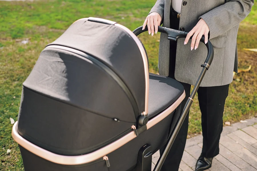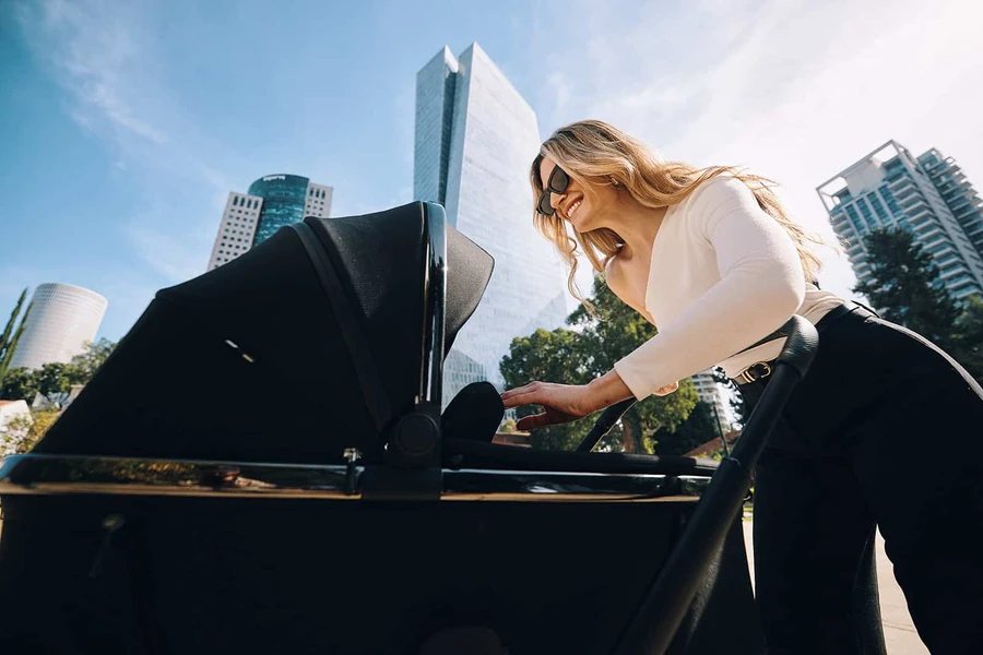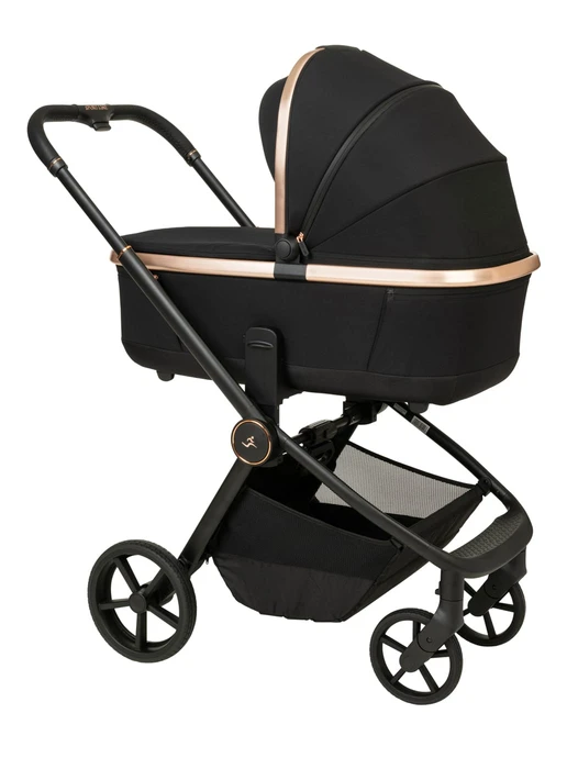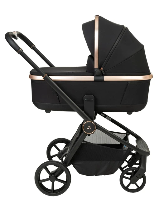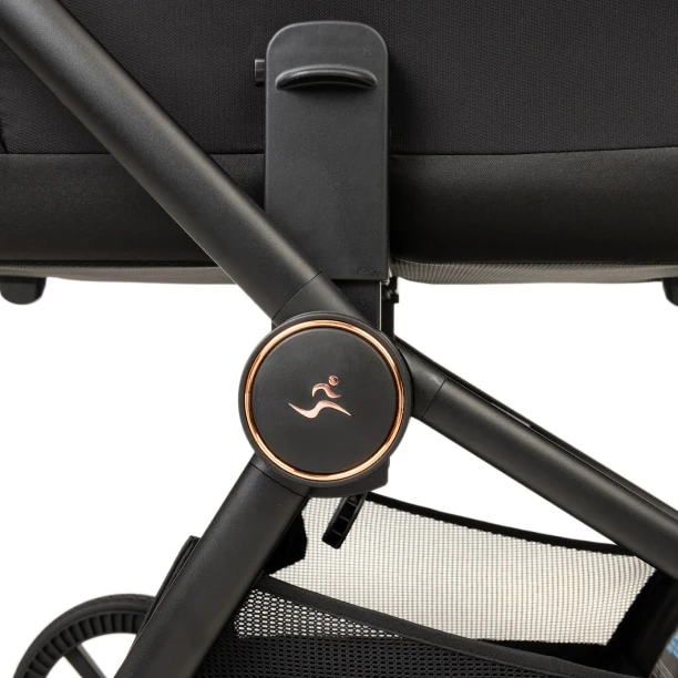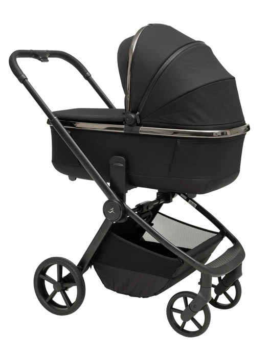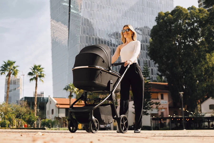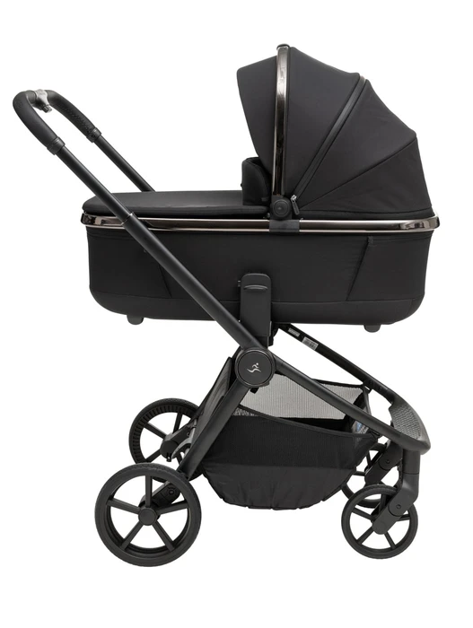 העגלה בעיצוב יוקרתי של כרום שחור לסל השכיבה וגגון הטיולון המעניק לה לוק אלגנטי במיוחד.