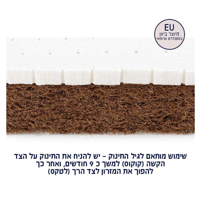 - שימוש מותאם לגיל התינוק – יש להניח את התינוק על הצד הקשה (קוקוס) למשך כ- 9 חודשים , ואחר כך להפוך את המזרון לצד הרך (לאטקס).