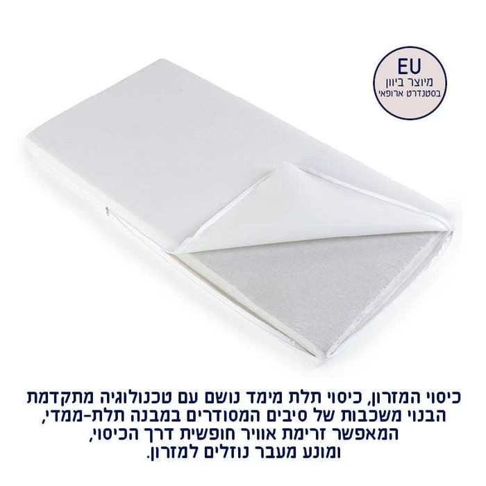 - המזרן עטוף בכיסוי תלת ממדי נושם עם טכנולוגיה מתקדמת המורכב משכבות של סיבים היוצרים מבנה תלת-ממדי, המאפשר זרימת אוויר חופשית דרך הכיסוי, מונע מעבר נוזלים למזרון.